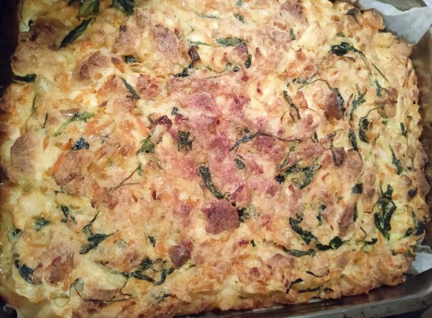 Celou veku nakrájíme na kostičky- nakrájíme cibuli – na oleji opražíme- přidáme umytý špenát, přidáme česnek, popřípadě mrkev, petržel, které jsem předtím orestovali na oleji- zamícháme a asi 10 minut dusíme- směs nalijeme na nakrájenou veku, přidáme vejce, olej, mléko, sůl- zamícháme- vše dáme na plech, kde máme pečící papír, který jsme ještě vymazali trochou olejem. Pečeme do zlatova. Pozor hmota zvětší objem, na plech dáváme do 3/4! Jinak je možné přidat do nádivky i orestované maso – uzené nebo vepřové.