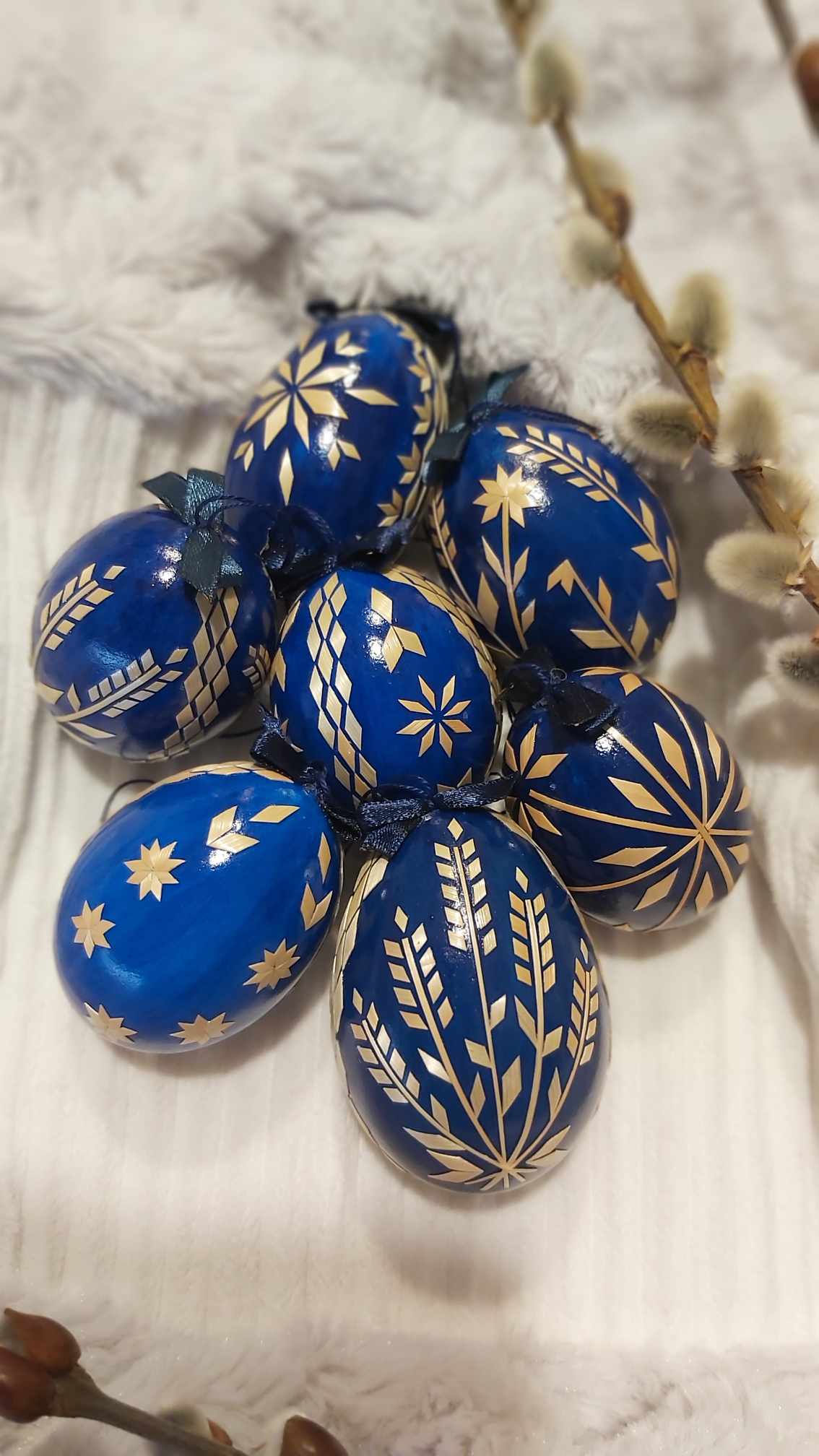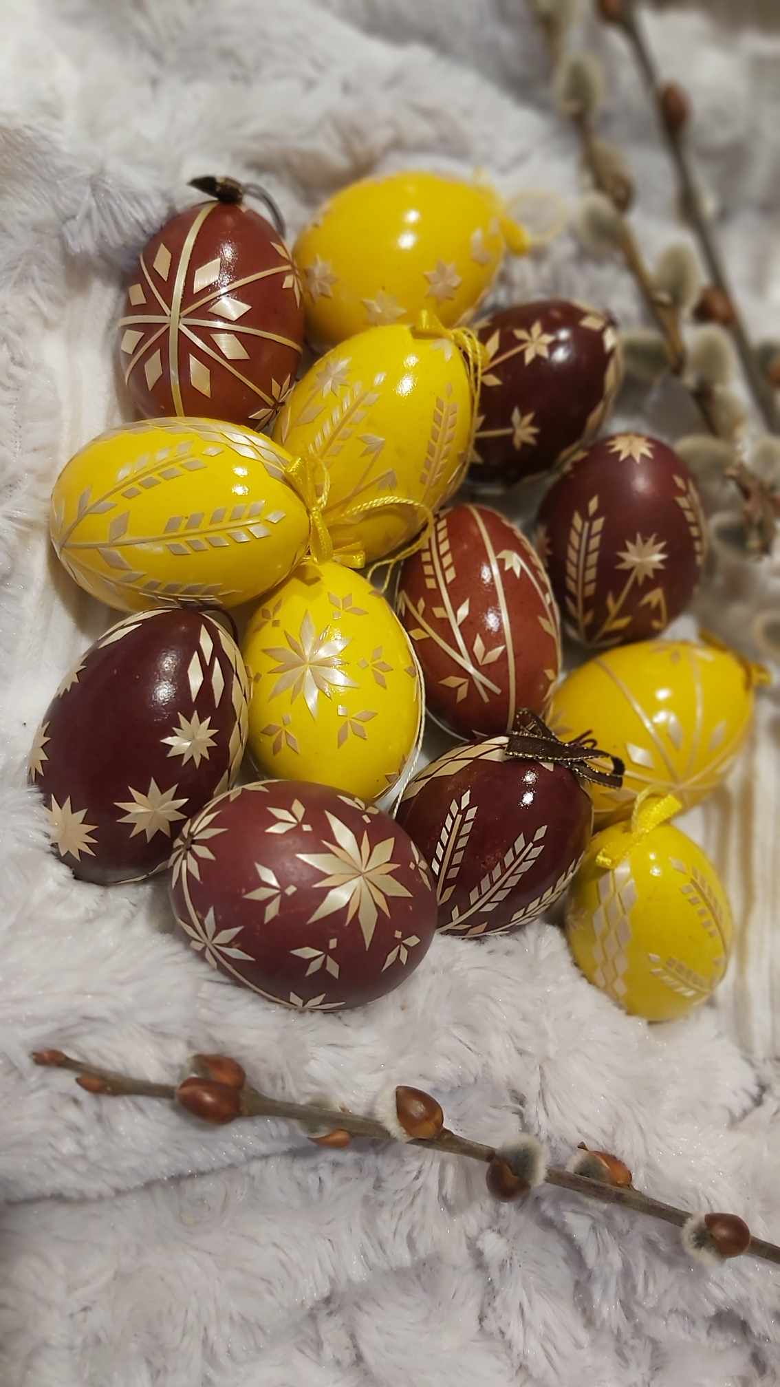 Vyfúknuté vajíčka, farebný tuš, slama, lepidlo na papier, transparentný lak, stužka