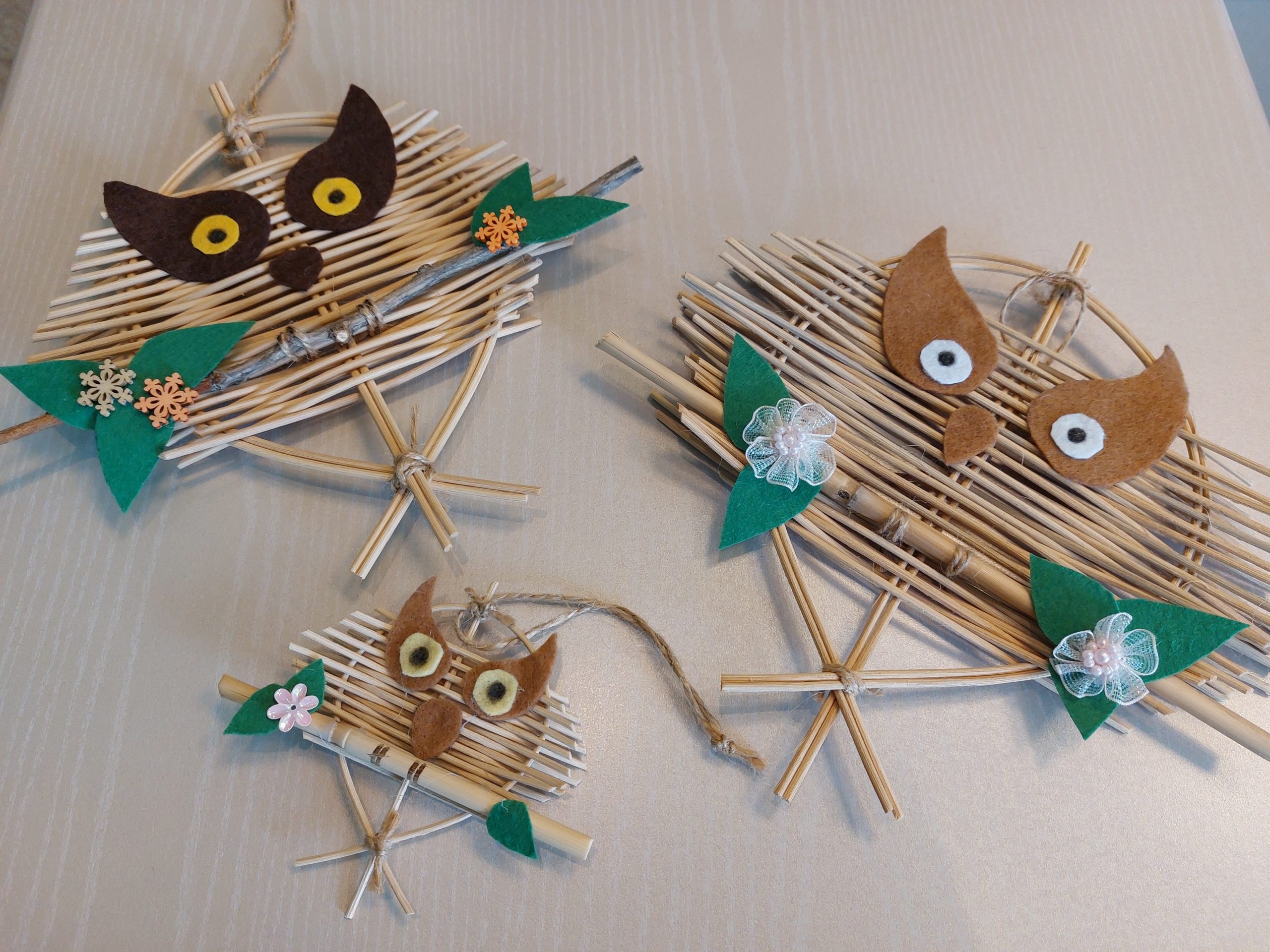 Dva nejdelší pruty stočíme do kruhu, přidáme do středu dva kratší pruty a dole konce svážeme provázkem. Vytvoříme tím osnovu pro proplétání. Ostatní nejkratší pruty postupně proplétáme přes osnovu střídavě, jeden horem, druhý spodem. Konce zastřihneme do tvaru. Vytvoříme tělo sovičky. Z filcu vystřihneme oči, nos a přilepíme na osnovu. Nakonec přivážeme větvičku a dozdobíme.