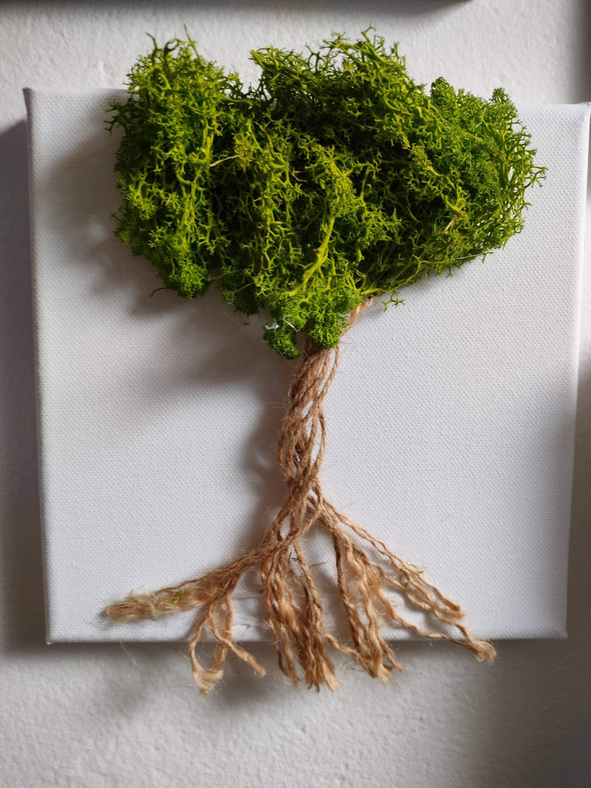 Na plátno jsem nejdříve zamotala několik jutových provázku podle toho, jak jsem chtěla mít kmen dlouhý plus něco na víc pod korunu stromu, ale to se pak ukrylo pod mech.přilepila jsem od shora asi 2/3 provázku a spodní část rozdělila na části, aby to tvořilo kořeny a když se mi to líbilo, tak jsem provázek přilepila. Pak jsem vzala mech a vytvořila korunu stromů a opět přilepila. Dolu ke kořenům je možné položit několik malých kamínků.